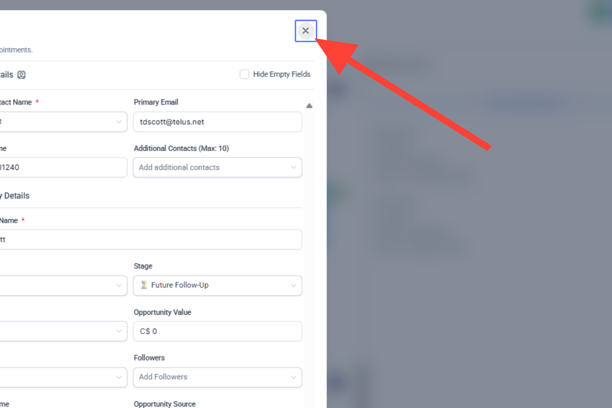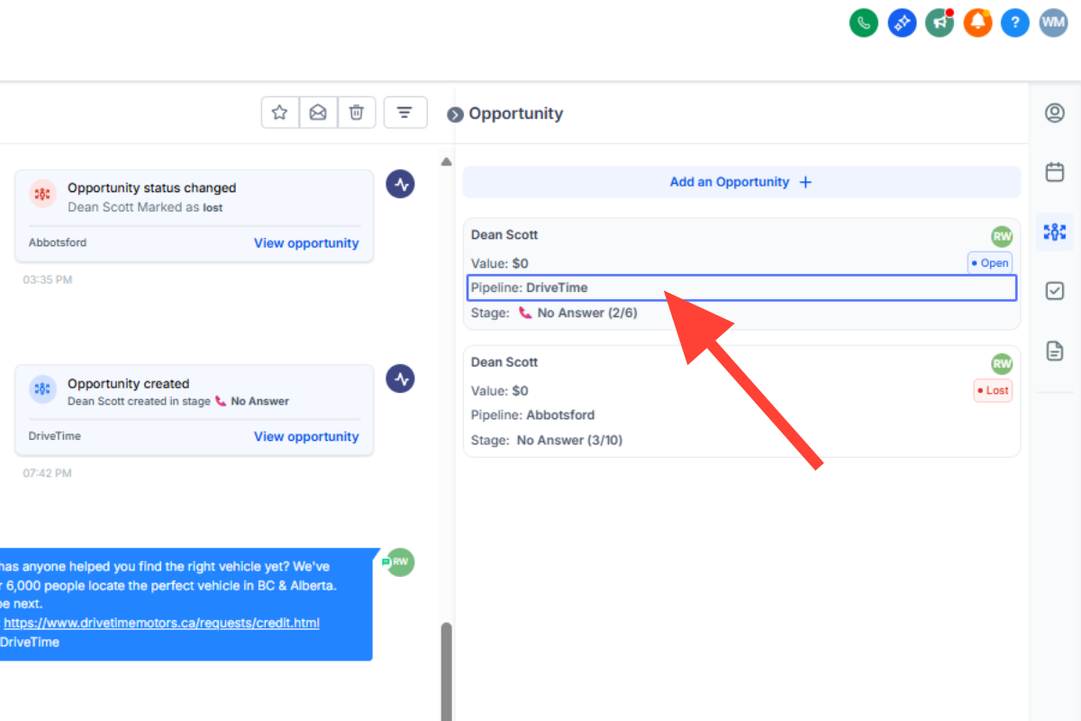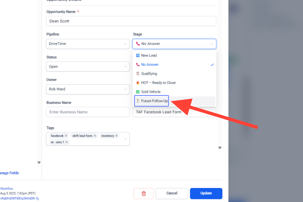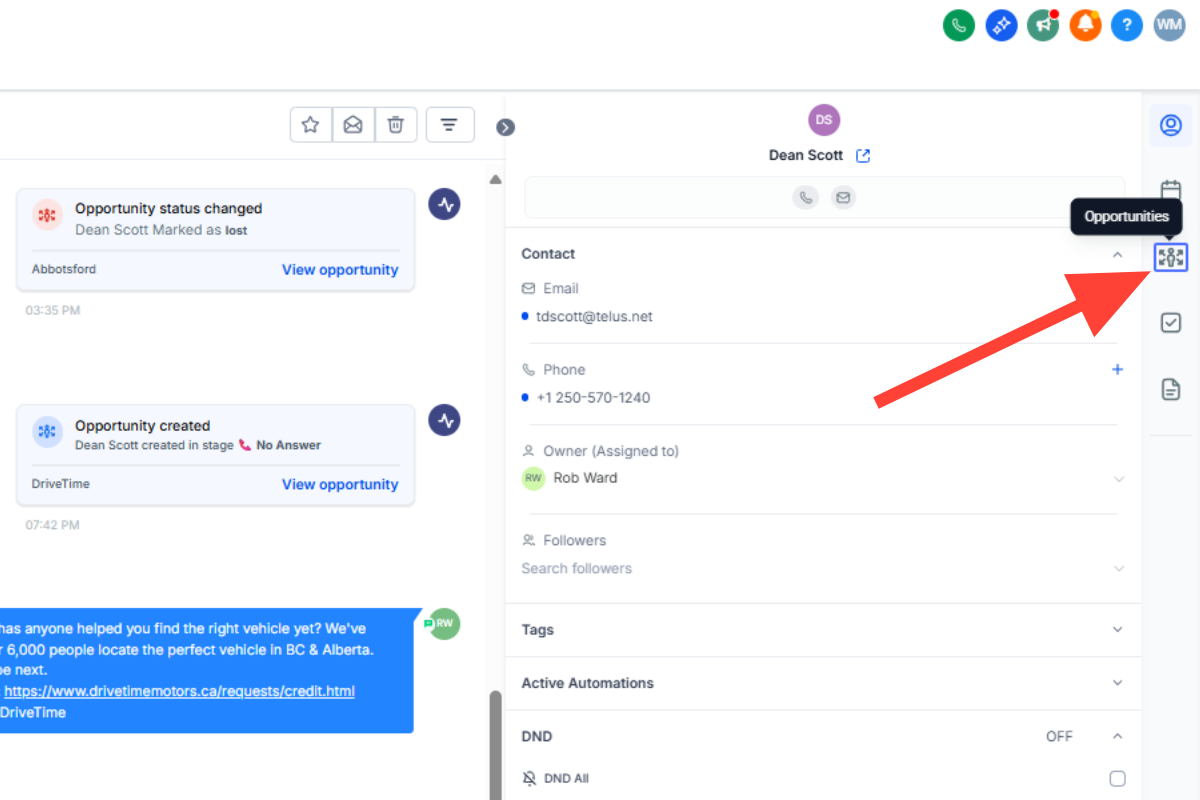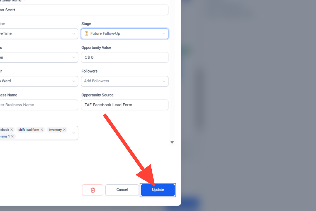 This guide provides a step-by-step process for updating the status of an opportunity on the Conversations tab. Follow these instructions and accompanying screenshots to efficiently change the opportunity stage and close the update modal.
