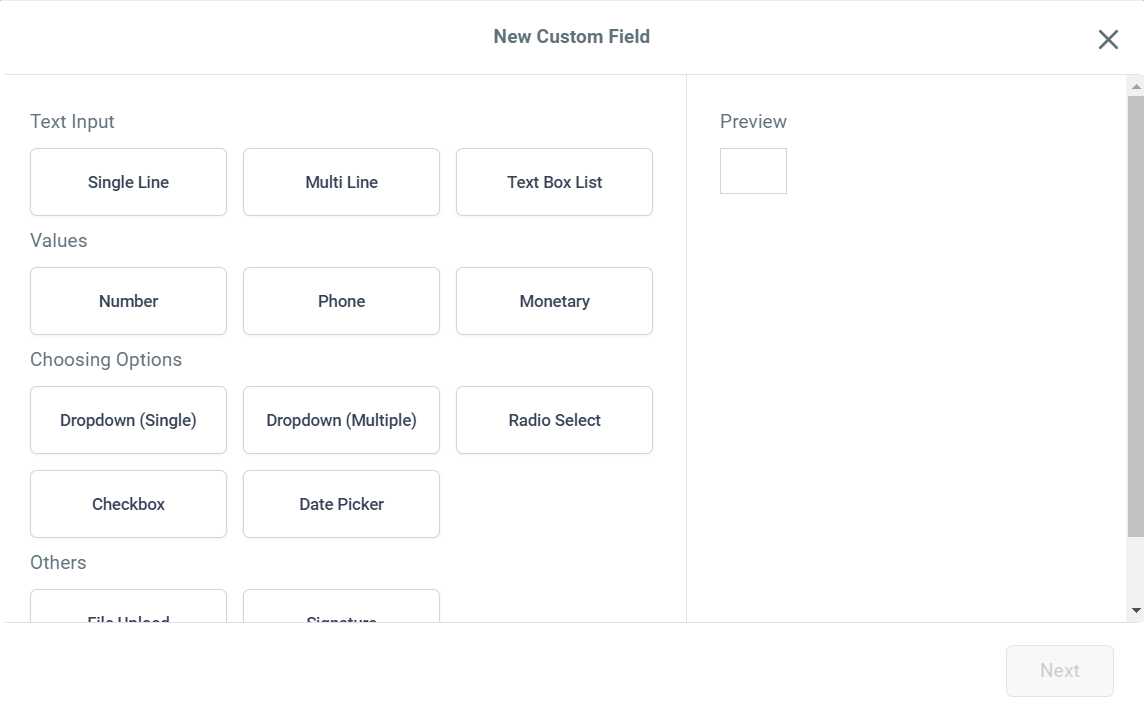 - In the Pop-up, you will have options for what kind of custom field you want to create